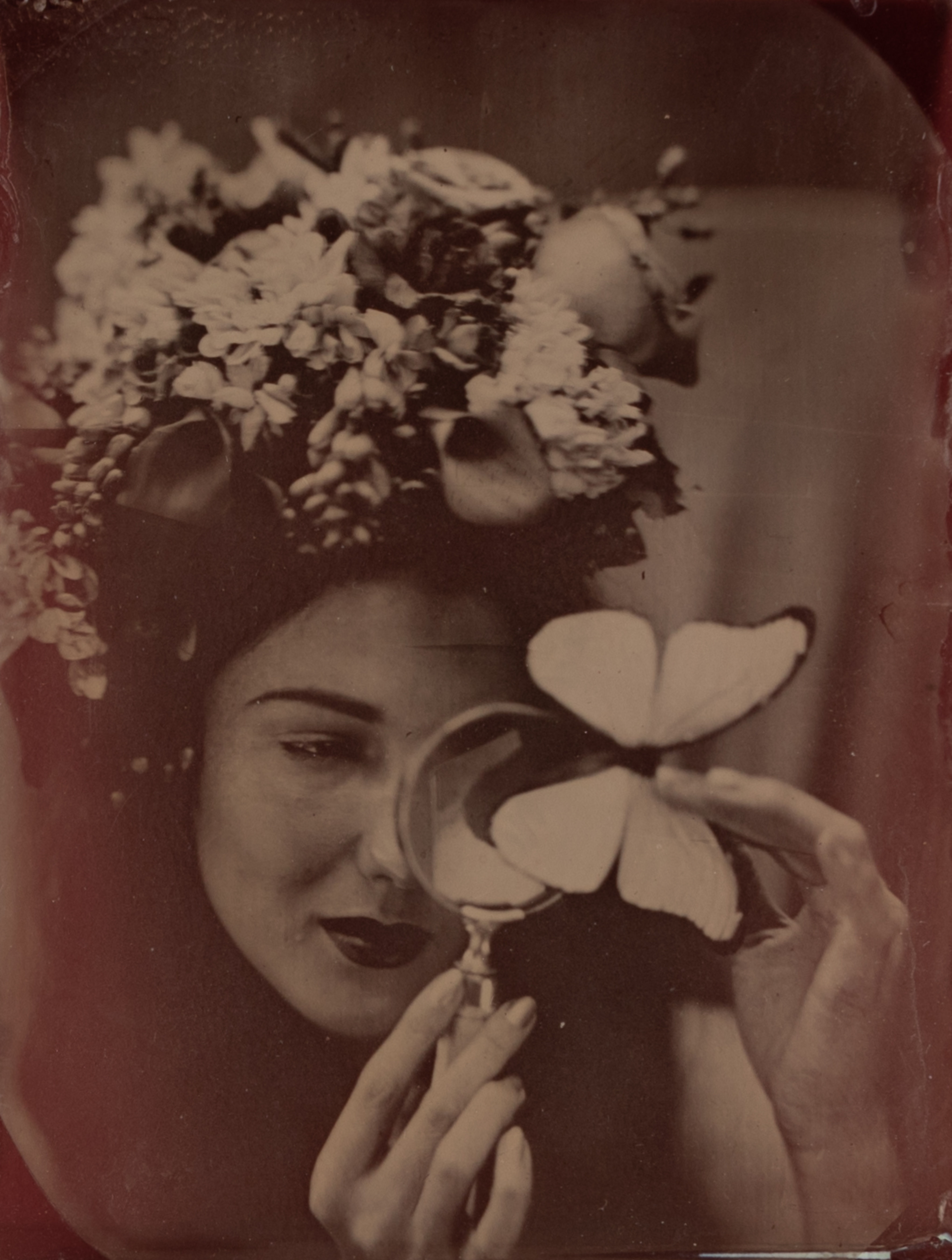 The process of wet-plate collodion is from before the era of mass production in the United States. When this process was invented, the fastest rate of speed that most ordinary humans could travel was at the speed of a horse… or perhaps a train. Wet-plate collodion is easy to do badly and challenging to do well. You are manufacturing your own chemicals and media on the spot… The ISO is less than one, and the process only likes the middle of the light spectrum. It's 'orthochromatic' much like early silent films, with a reduced scale of greys, so that in silent films the actors would have black lipstick and dark makeup to add contrast, and I often have my subjects use dark makeup to compensate for the reduced tonality.